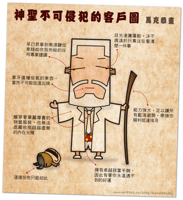 客戶是另一種奇妙的族類,雖然他們的智力和老闆約在伯仲之間,但他們的權力大於你的老闆、財力大於你的老闆,所以客戶是有能力〝代替月亮懲罰你老闆〞的人。因此連老闆都必須俯伏在他的腳前獻上敬拜和讚美,那我們這些小嘍囉豈有在他面前撒野的份?所以接下來幾週,我就來分享一些這幾年來我面對客戶的一些小小心得,也歡迎大家一起參與討論。