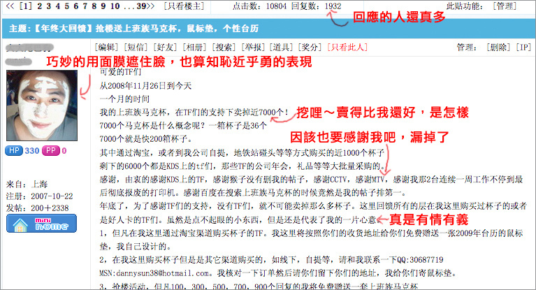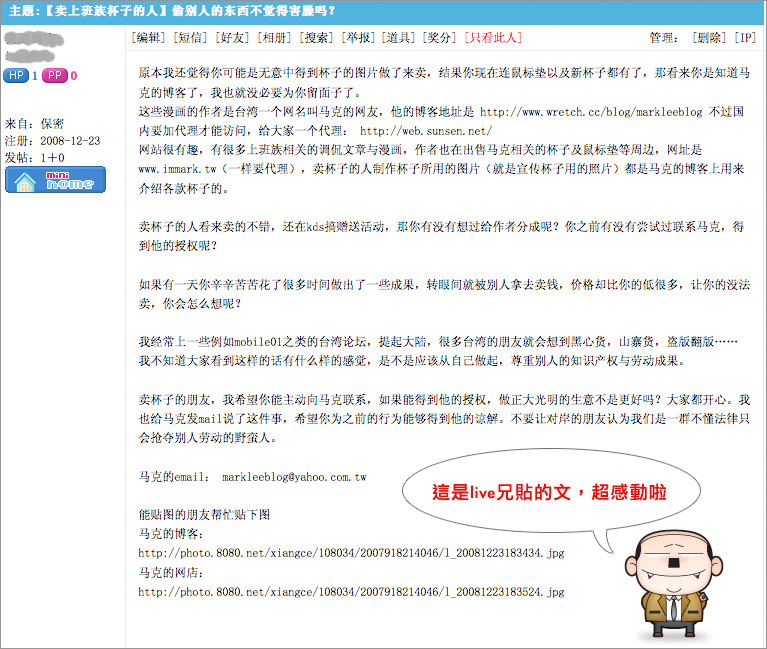 帖子裏面我也寫出了自己的想法,我想說大陸不是每個人都沒有保護版權的觀念,不是每個人都沒有良知,不可否認現在和臺灣比也有很大差距,希望以後的狀況會越來越好。但願那個賣杯子的人能夠認識到自己的錯誤,像我在帖子裏說的那樣,給您道歉。希望他能夠得到您的原諒。