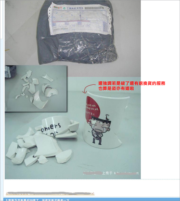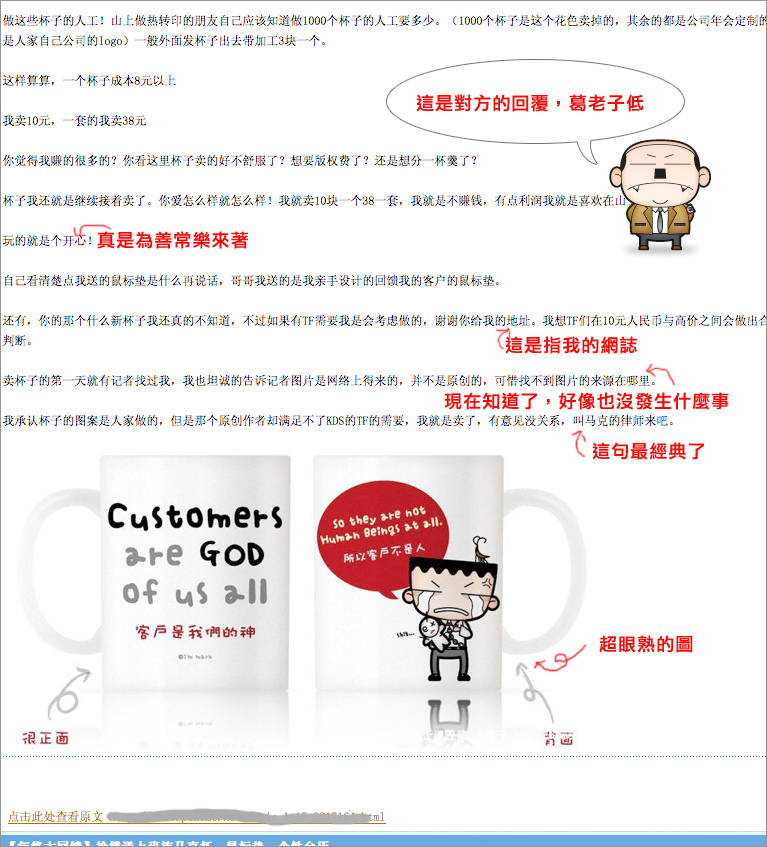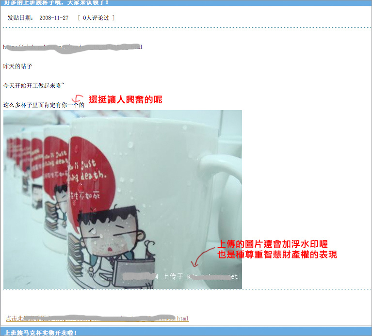 但是沒過多久我就在經常會看的一個論壇裏看到有人在賣和你一樣的杯子,而且價格很低,只要10元人民幣一隻(不到50新臺幣),很明顯是翻版的。一開始我以為只是賣家無意中得到了您杯子的圖片,覺得不錯就做出來賣,大陸這邊也沒法直接訪問到你的部落格,也就不清楚這些漫畫的作者是誰,可是之後我發現他連你的新杯子以及滑鼠墊也有了,事實很明顯了,我忍不發貼指出了他的行為。