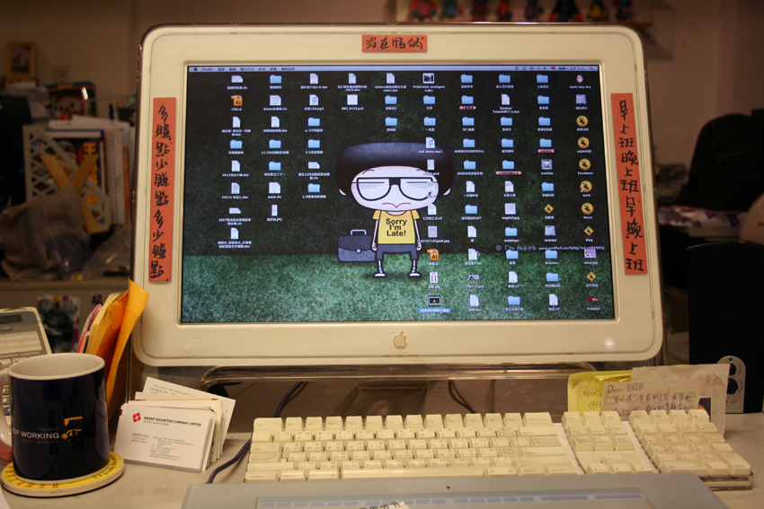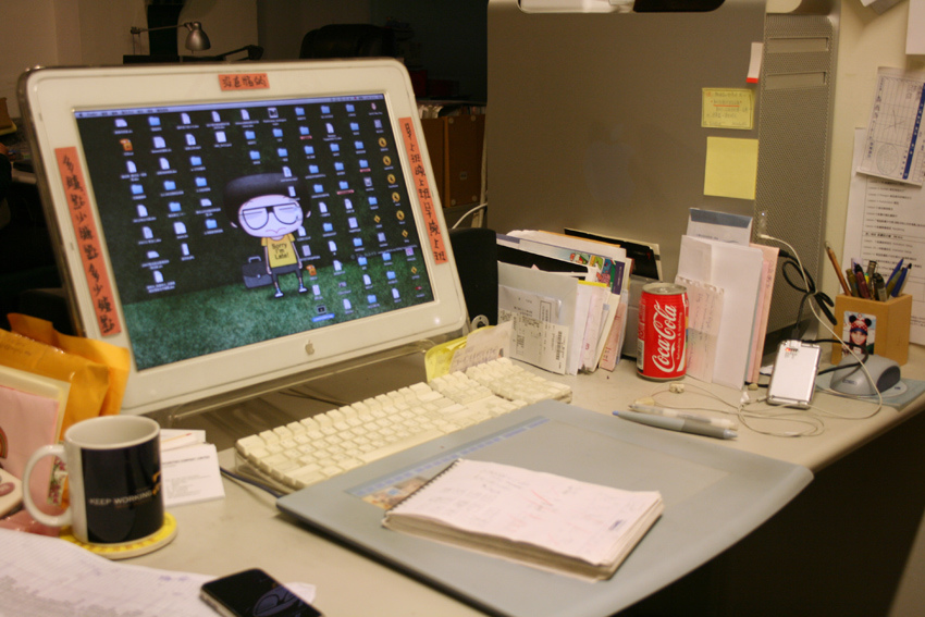 為了拋磚引玉,我就先不要臉的把我的辦公桌面貼上給大家瞧瞧啦,保證原汁原味,絲毫沒有做特效處理(我的所有同事都能為我做見證),事實上最亂的地方是桌子左邊與後方,我很有技巧的用攝影的死角避開了。