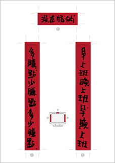 至於我電腦螢幕上的春聯,則是我最近才貼上去應景用的,你若是喜歡可以按下方小圖後自行下載,我已經將圖製作成A4大小,下載後可利用公司的印表機直接列印,我還貼心的做好了裁切線勒。
