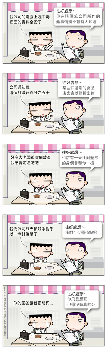 既然外在環境不是你所能控制,至少可以控制自己的想法保持正面,若凡事用樂觀的態度去面對,你會驚訝的發現只有正面情緒能帶來正確的答案,真的,我屢試不爽,反正現在困境可說是垂手可得,不妨從中挑幾個用來試試看吧。