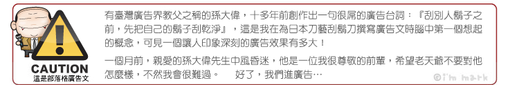 在切入今天的廣告主題之前,我們就先來聊聊『刮鬍子』的另一個含義,也就是這個詞有被責備、訓斥之意。而在職場中這類的刮鬍子更顯得傷人,因為你往往不是被天才罵笨蛋,而是被笨蛋罵笨蛋,尤其是金字塔底端的人最有感觸。