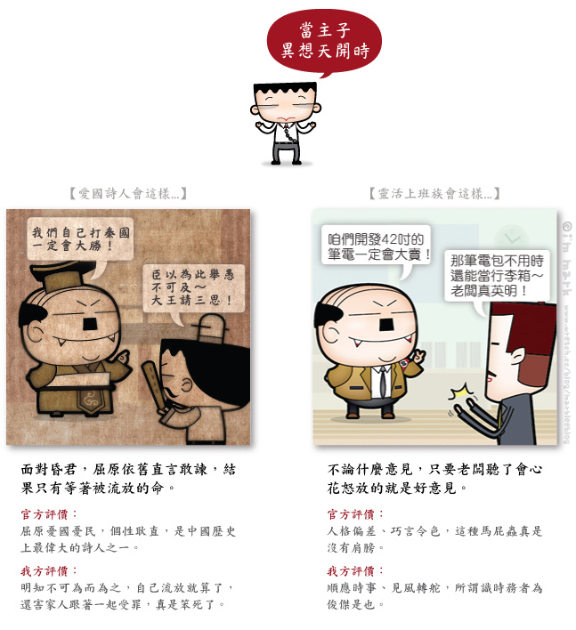臣子與主子的關係其實有如現今員工和老闆的關係,我認為現在的上班族雖然不如屈原那樣有才幹,但是依據達爾文的進化論,現代上班族已經發展出更適生存的方式,絕對比屈原這傢伙靈活多了 :