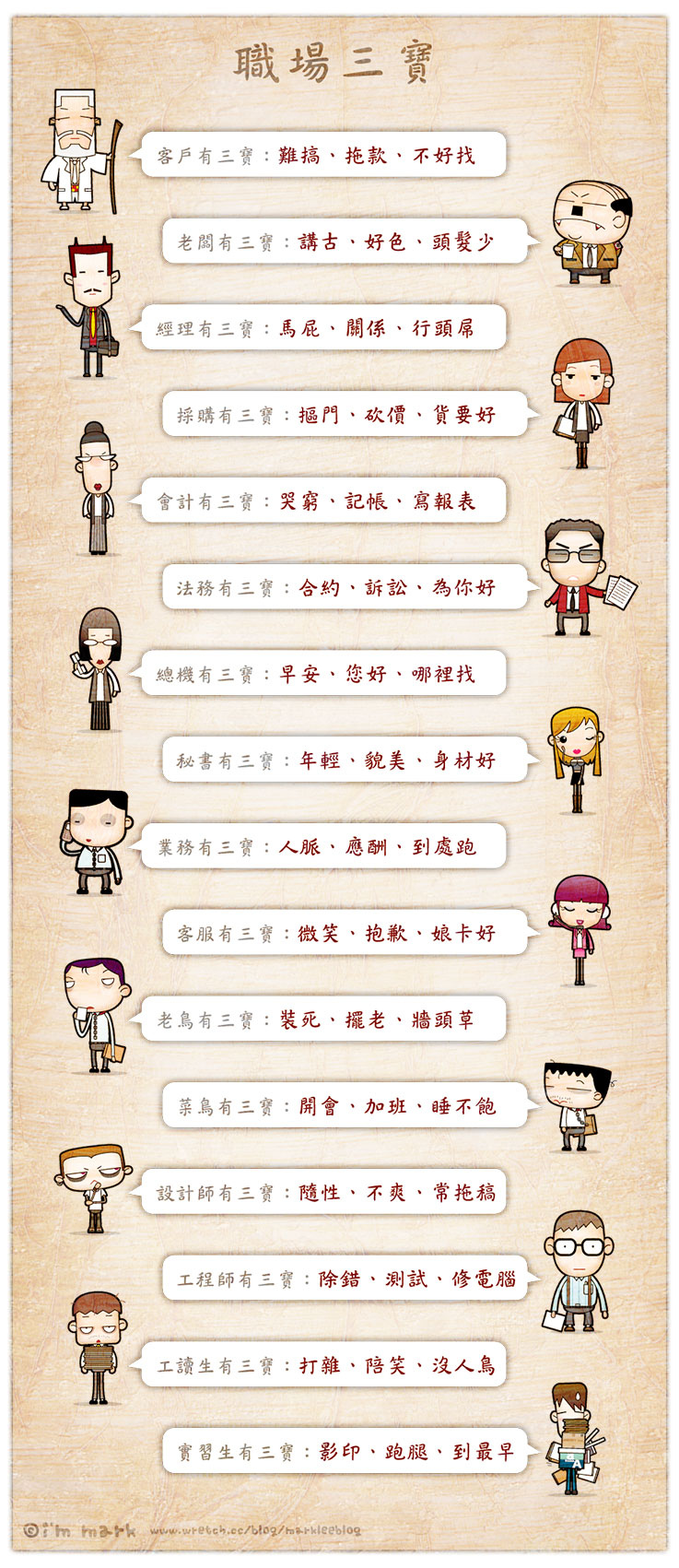 前兩週有位網友貼了一份由“東北有三寶:人蔘、貂皮、烏拉草”所改編的打油詩給我,內容富饒趣味,引發了我的創作衝動,今天也來以此架構為基底,讓大家來看看職場中的三寶有哪些吧…