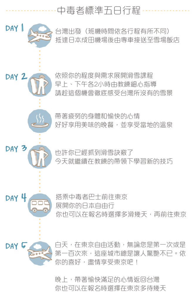 簡單來說,中毒者是一間把滑雪變平價的旅行社,不過對於一個沒滑過的人來說,大概還是覺得這運動遙不可及又貴(就像以前還沒滑過雪的我),然後心裡充滿疑問:要不要買裝備(就像以前的我)、肯定很花錢(就像以前的我)、一定很冷(好在本人不怕冷),重點是我不會滑(就像以前的我) 。我認為日本滑雪中毒者厲害之處就是他們先解決了這些問題: