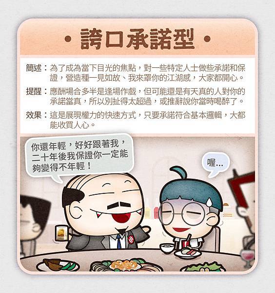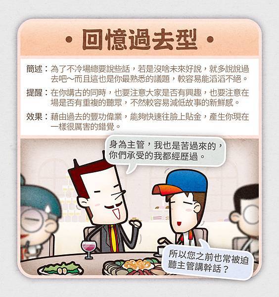 你應該會發現餐桌上除了你敬我乾的吃喝基本架構外,大家的對談互動,基本上有幾種類型,