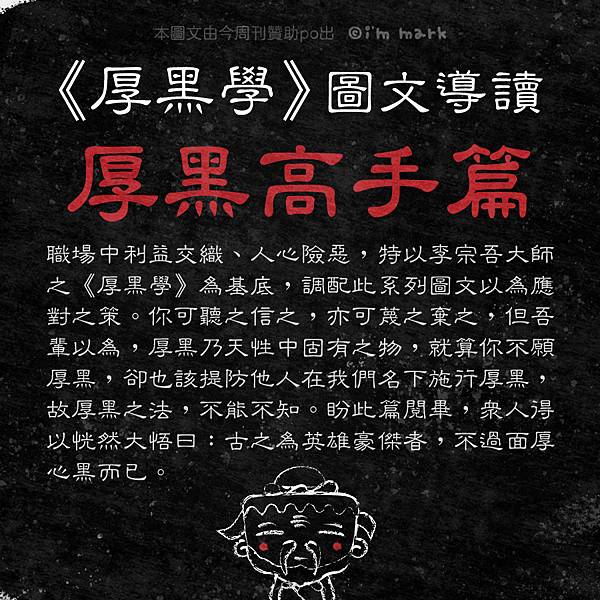 我一直很喜歡將東方文學與職場做結合,多年下來我嘗試過用圖文方式解析《三十六計》、《二十四孝》、《三國志》與《孫子兵法》,今天我再次挑戰一個冷僻但大家多少都聽過的《厚黑學》。我個人認為,這個當權者與正統文化人都不太認同的著作,絕對是所有入社會的人要略懂的智慧,接下來的幾週,我會用圖文的方式為大家講述這個學派,也請大家細細品味與珍惜,因為這年頭像我這樣瘋狂的創作者,實在是不多了。