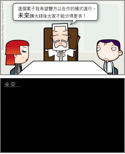 客戶雖不會多給你酬勞,但為了安撫大家的情緒,他們也會用其他的方式誘騙你,讓心甘情願繼續為他賣命,方法很多,我只能簡單舉例以下是三個比較常見的說法: