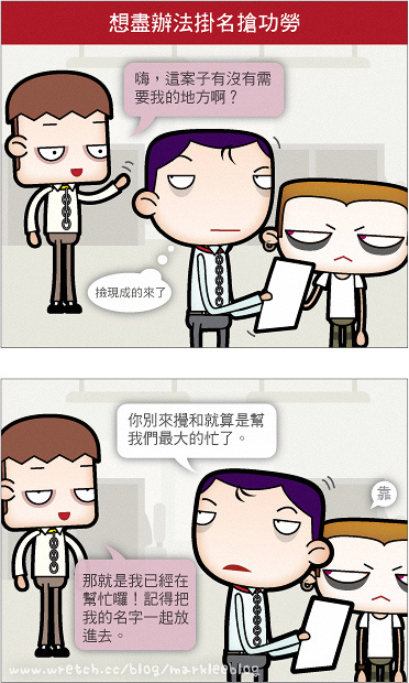 馬克說..欲加之罪何患無詞,欲搶之功亦然。往往在事前一個屁也沒放的人,到最後論功行賞時就爭先恐後的出現,告訴別人自己才是整件事情的關鍵人物,然後鬼扯一堆只有白癡才會相信的鬼話,所以老闆都信了。