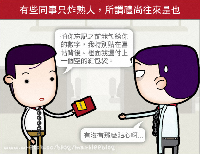 在職場,遇到有同事、主管、客戶辦喜事的機會也不少,雖然以離婚率來看,你每參加四次婚禮就有一個是毫無意義的浪費,但是基於做人的基本原則,與從小四維八德的薰陶,我們還是要花上自己假日的時間,拿著自己的血汗錢,去祝福大部分都不是太熟的人。只是這紅包的行情最基本也要1800起跳,一般也要的23千,好一點的58千可跑不掉,有的關係特殊,包個上萬塊也是常有之事,所以這俗稱的紅色炸彈有一度真的造成我生活上不少的壓力,我最高記錄兩個月加起來被炸9次,那時窮到我坐捷運都想假裝自己是盲胞。