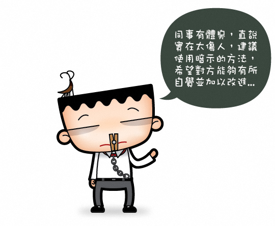 其實以上這些臭味只要當事人多加注意,通常都可以讓這些異味減到最低,甚至到別人完全不會發現的境界。但,我卻發現這些當事人大都不覺得自己的味道會影響到其他人,每天都很有味道的活在自己的世界裡卻苦了大家。我認為身為受害者,應該還是要鼓起勇氣站出來,勇敢的為自己說話。