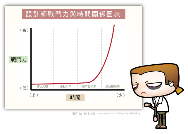 就我所知不少設計界中曠世的巨作都是在deadline的前一刻才被創作出來,以下有個簡單的表格與圖說,可以幫助大家瞭解時間與設計師的創作之間的關係,也可從中窺探一下正港設計師的內心世界。