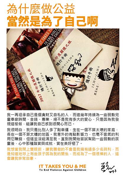 參加3月10日EVAC《漫漫回家路》電影公益場,以及4月29日「終止兒童受暴 你我挺身做到」音樂分享會,