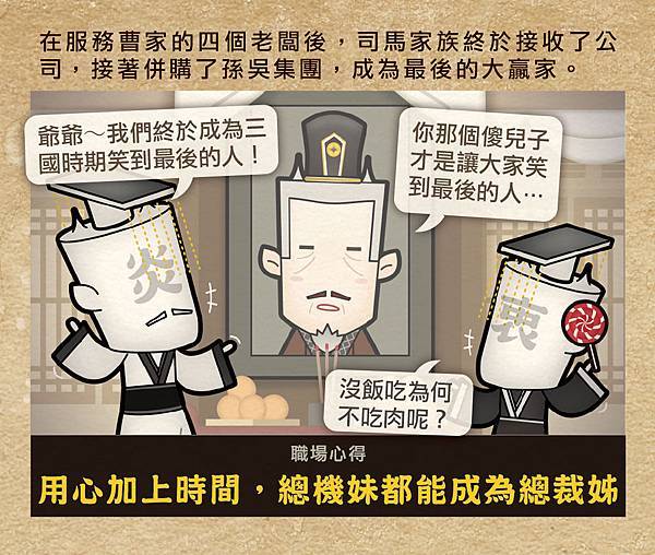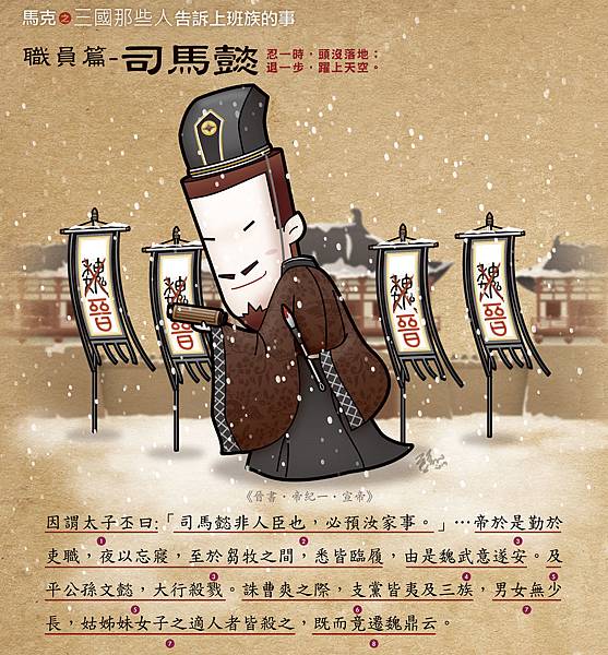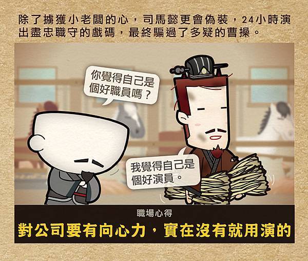 3.司馬懿怕被老闆幹掉,決定勤奮工作、自願加班,連餵食牲畜這種事,都自己親自處理,真是個聽話的乖寶寶。